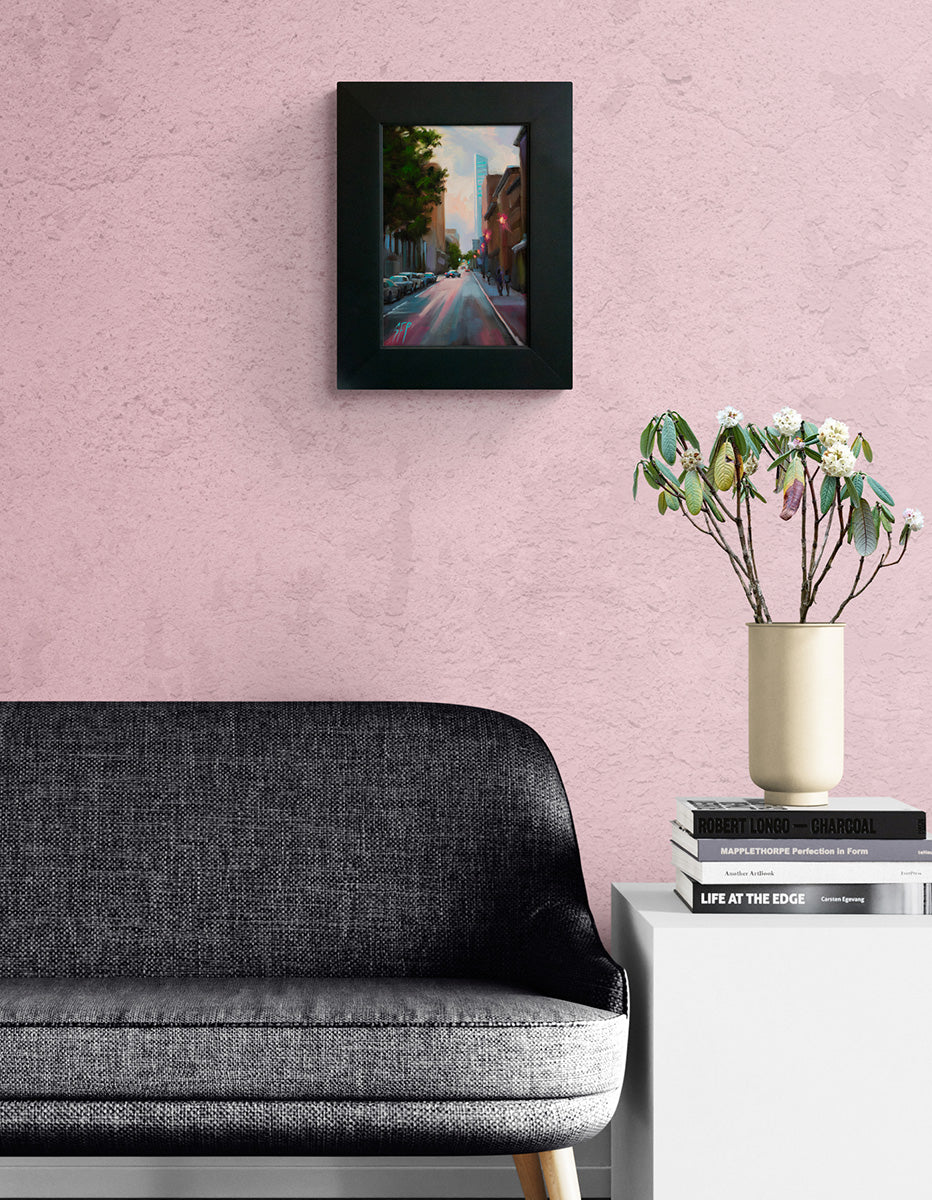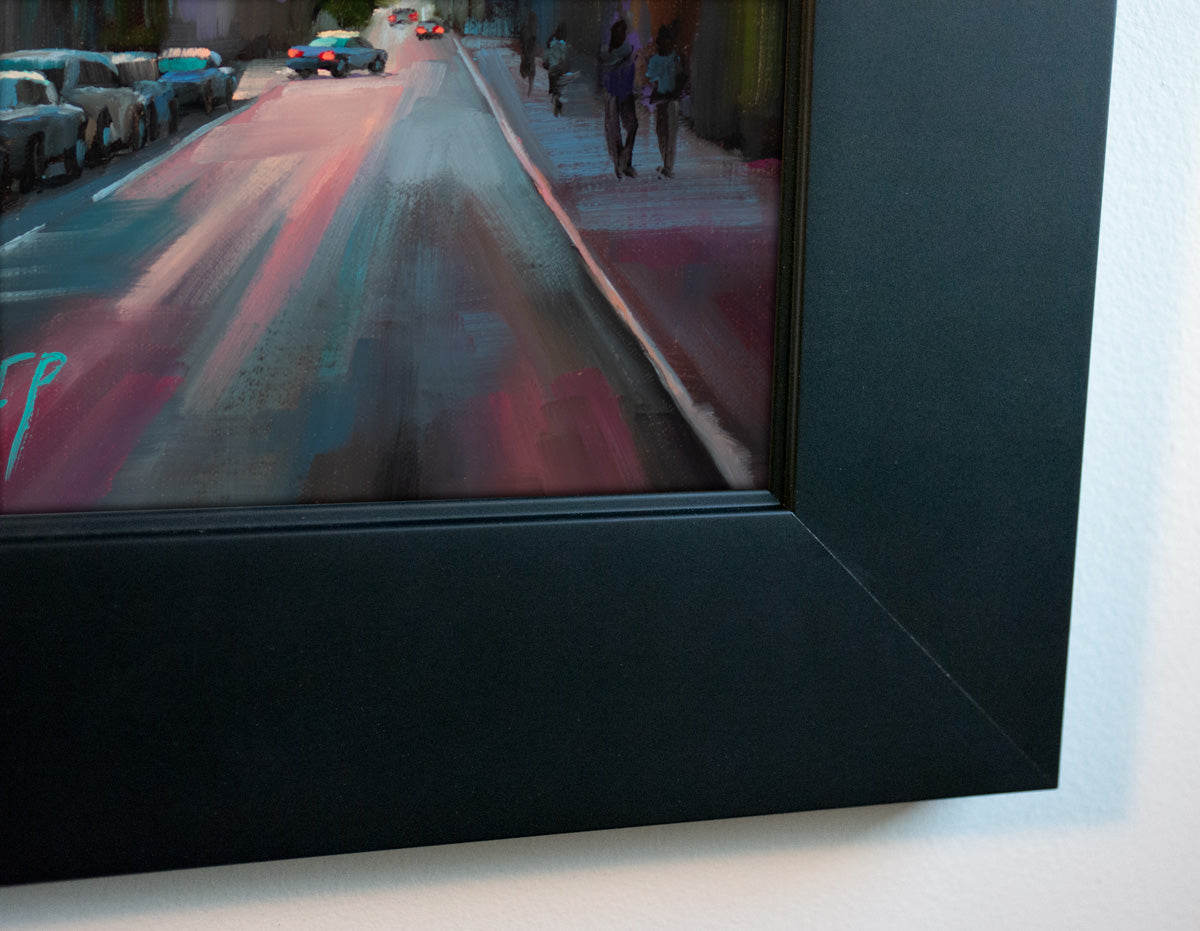 I caught this moment at 20th Street in downtown Philadelphia, looking west down Walnut Street during a summer evening. One recurring theme in my paintings is that I enjoy exploring Mother Nature’s amazing skies juxtaposed with manmade edifices and lights. I loved the perspective in this composition, as well as the subtle twilight colors throughout.