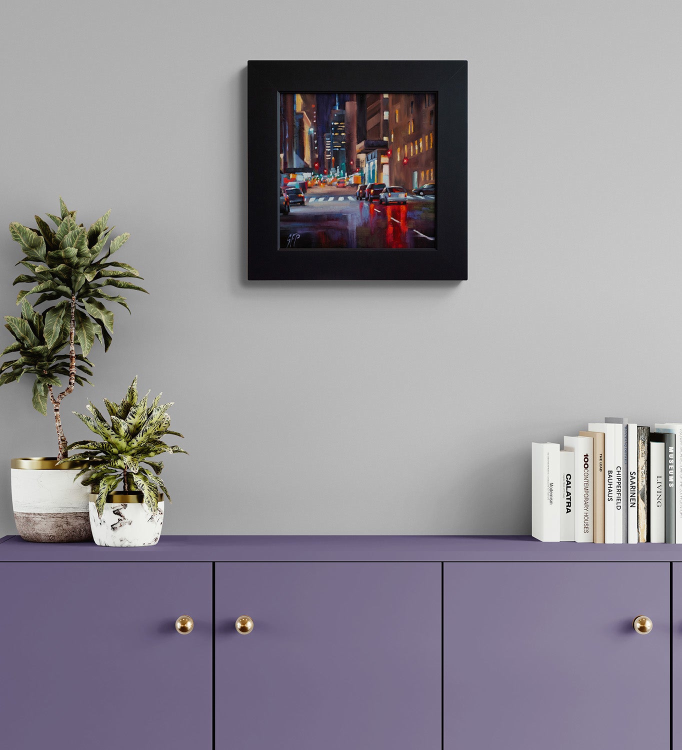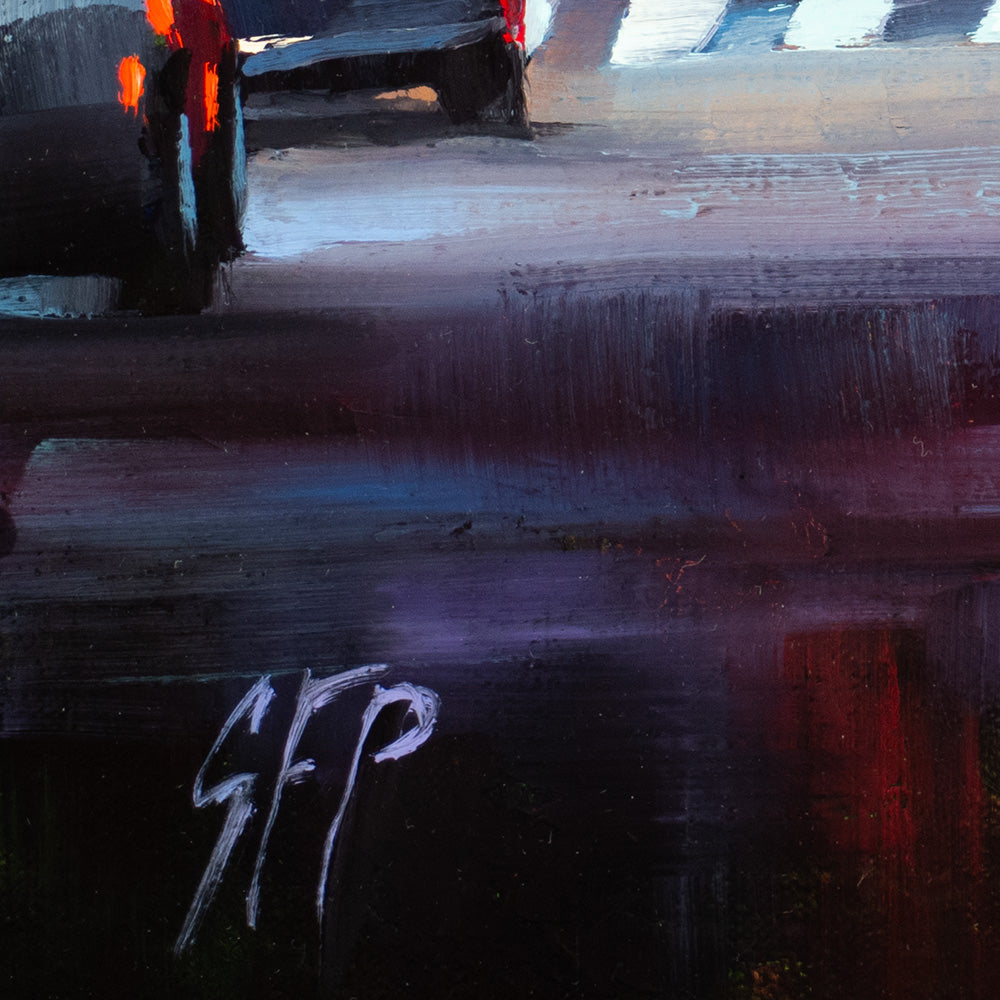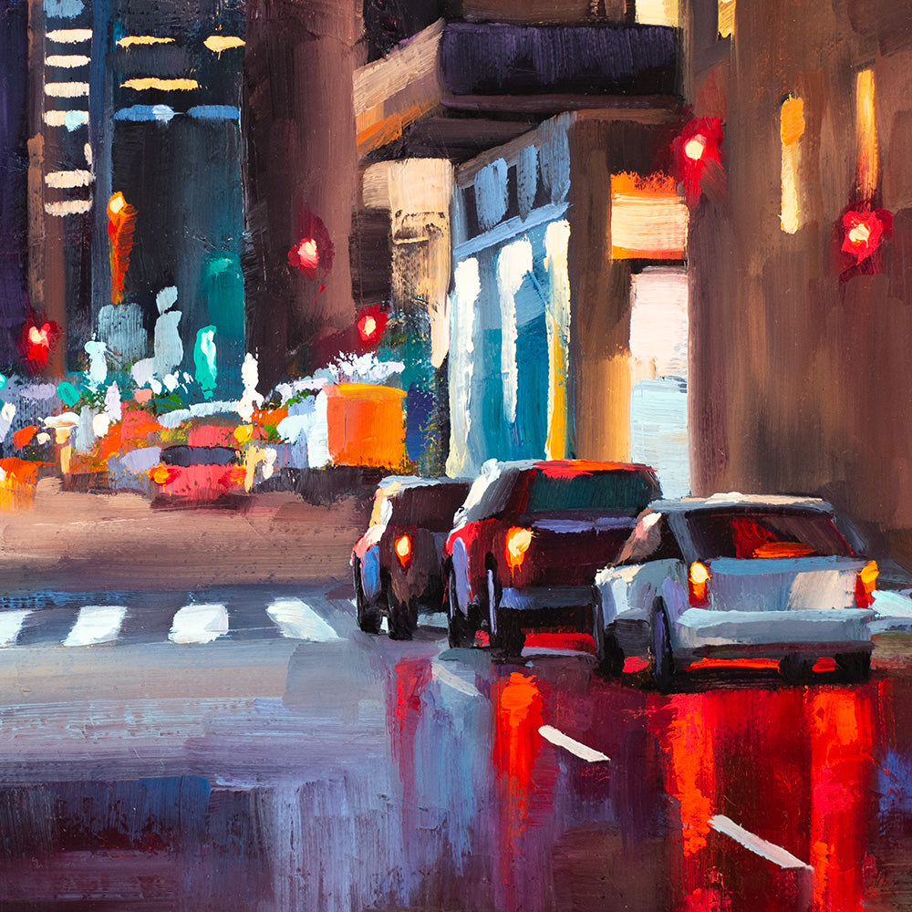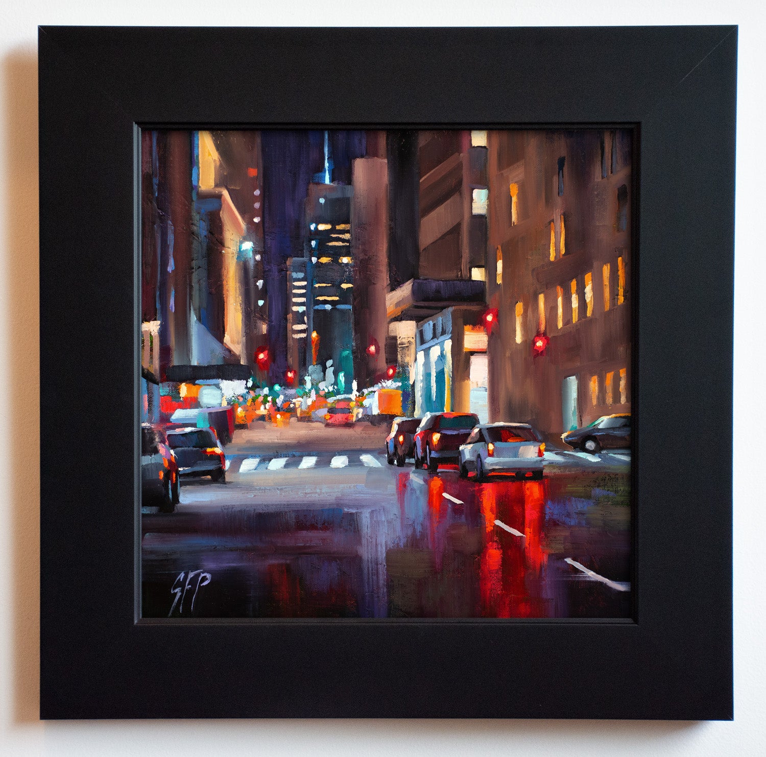 A rhythm of bold colors and bright lights drew my eye to this subject in midtown Manhattan. This is the preparatory study for a larger painting, "The Darkest Light."