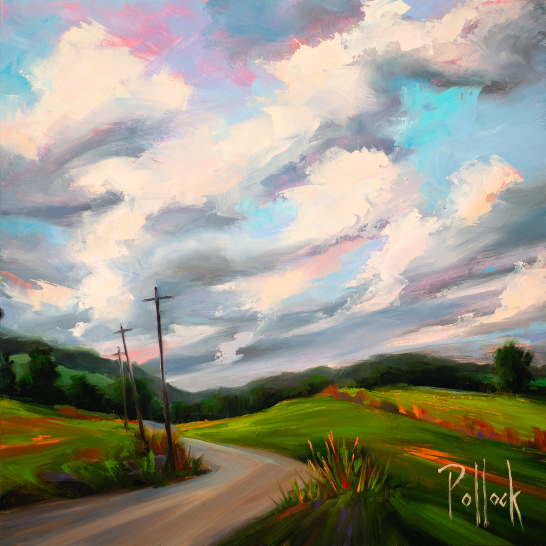 I painted this on location in East Tennessee from the back of my truck. I could not have asked for a more idyllic summer morning. The cotton ball clouds captivated me, and when I found this rural intersection in Loudon County, Tennessee, I briefly flashed back to my youth in southern Wisconsin, where the country roads ran across the open landscape beneath expansive skies just like this.
